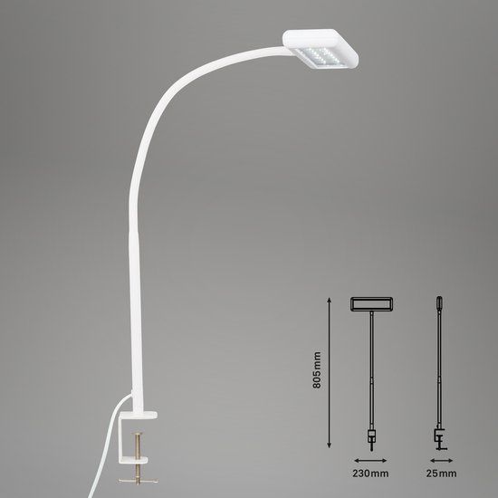 - De LED-printplaat van de bureaulamp overtuigt met een energiebesparing van 7,5 watt en een lichtopbrengst van 800 lumen. De kleurtemperatuur van de klemlamp is 6500 Kelvin.