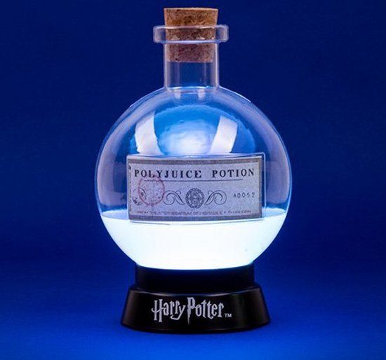 Potion lamp van Harry Potter. Moodlight in de vorm van een drankje dat wordt gebrouwen in een laboratoriumflesje. De lamp geeft licht in verschillende kleuren, die in elkaar overlopen. Deze grote variant van de Potion Light is 20 centimeter hoog. Hij werkt op 3 AA-batterijen (niet inbegrepen). Leuk om als nachtlampje te gebruiken.