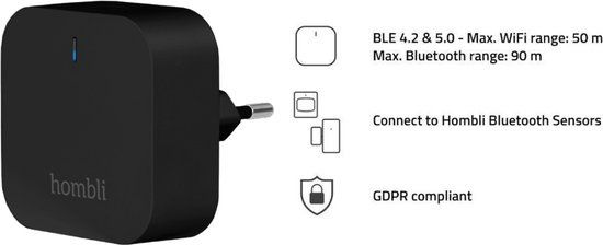 De Smart Bluetooth Bridge steek je in het stopcontact en koppel je via de Hombli app aan je wifi netwerk (2.4GHz). Deze hub maakt gebruik van energiezuinige, veilige en betrouwbare Bluetooth technologie om verbinding te maken met sensoren.