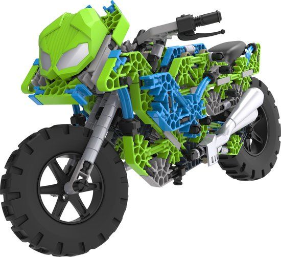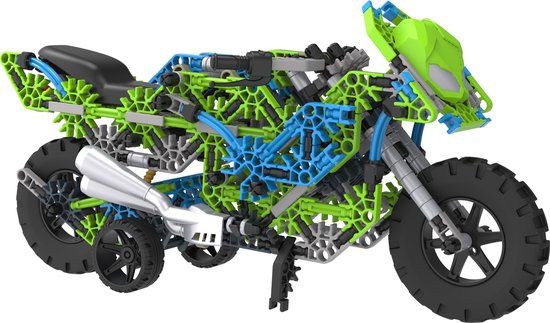 Met deze bouwset van K’NEX komt de verbeelding van je kind tot leven, een grote en fantastisch snelle motor die je helemaal zelf in elkaar kunt zetten! Het felle groene met blauwe voertuig rijdt op draaiende wielen en is gemaakt van kleurrijke staafjes en koppelstukken waardoor je met een “klik” de onderdelen samen kunt brengen. De motor bevat ruim 456 onderdelen en kan ieder ander voertuig zeker afstoten van de race. Bereid je kind voor op hun technische vaardigheden en leer ze de basis van het bouwen. De motor werkt op batterijen.
