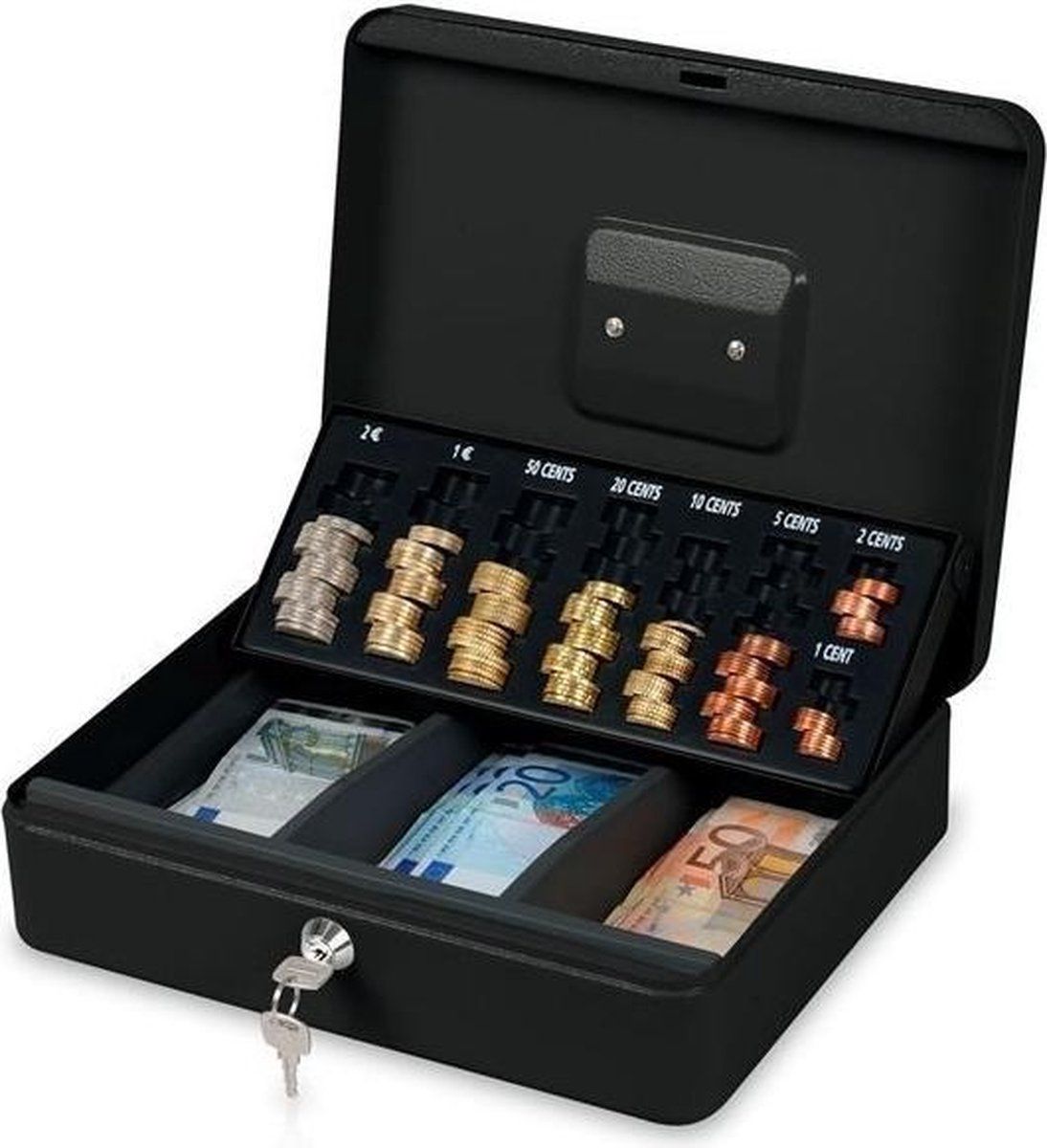 Deze handige geldkist heeft een inleglade voor briefjes en een afzonderlijke muntsorteerplaat met 8 muntcompartimenten om alle euromunten per soort op te bergen. Je geld is dus keurig en goed beschermd opgeborgen. De geldkist is gemakkelijk mee te nemen dankzij het handvat.