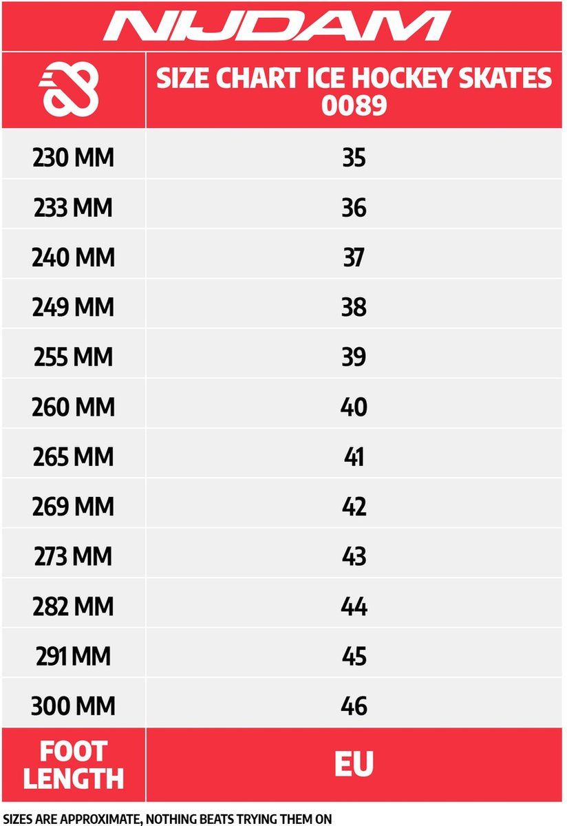 IJshockeyschaatsen van Nijdam met harde kunststof schoen en uitneembare binnenschoen. De schoen heeft drie snelsluitingen. De roestvrijstalen schaatsijzers zijn reeds voorgeslepen.Specificaties