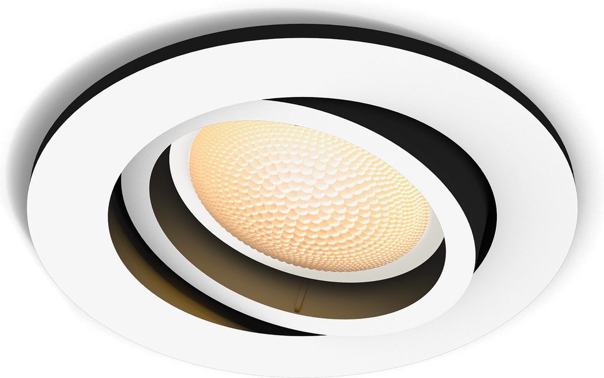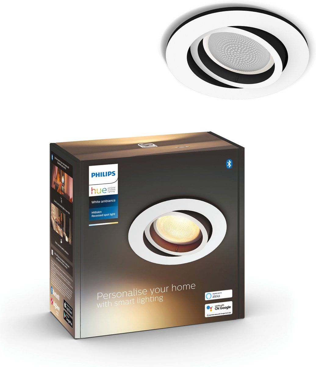 De Philips Hue Milliskin is een inbouwspot met een wit, rond ontwerp met centraal daarin een ronde richtbare spot die is omlijst met een chique, dunne zwarte rand. De White ambiance LED-lamp levert warm tot koelwit licht. Je kunt via Bluetooth de spot eenvoudig draadloos dimmen, in- en uitschakelen of één van de vier voorgeprogrammeerde lichtrecepten selecteren met de Hue app. Wil je alle slimme Philips Hue functies gebruiken, zoals het personaliseren van lichtscènes, timers en automatiseringen, dan verbind je de lamp met een Philips Hue Bridge.Bedien tot wel 10 lampen direct via Bluetooth