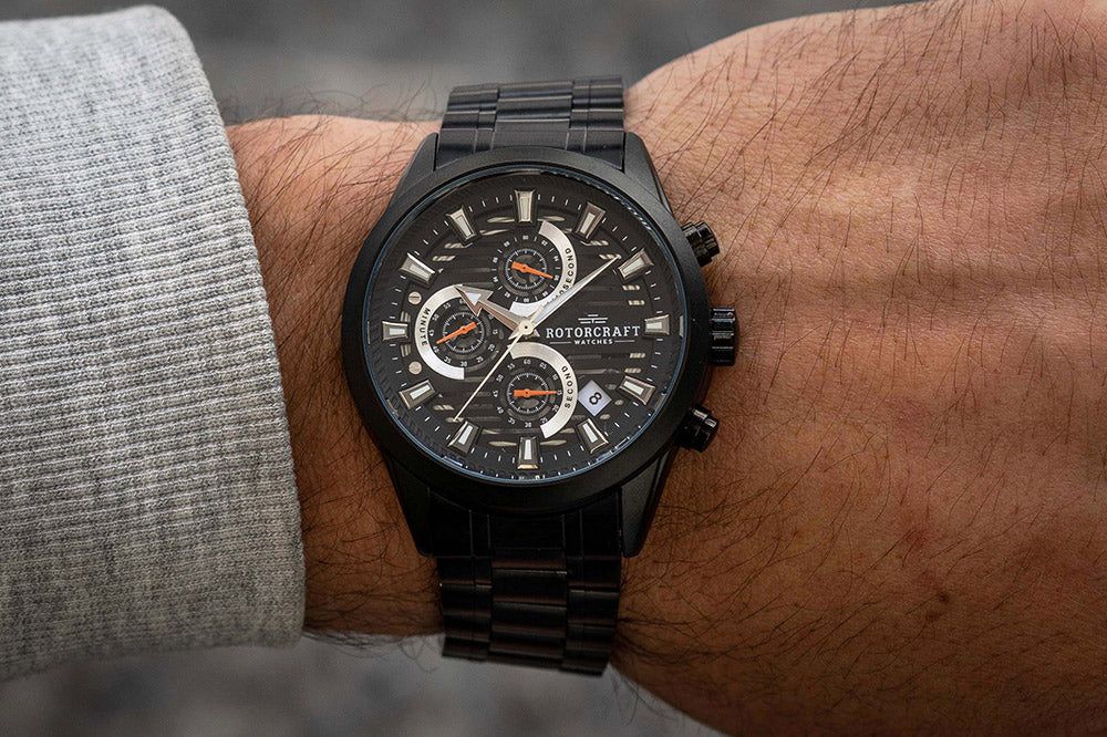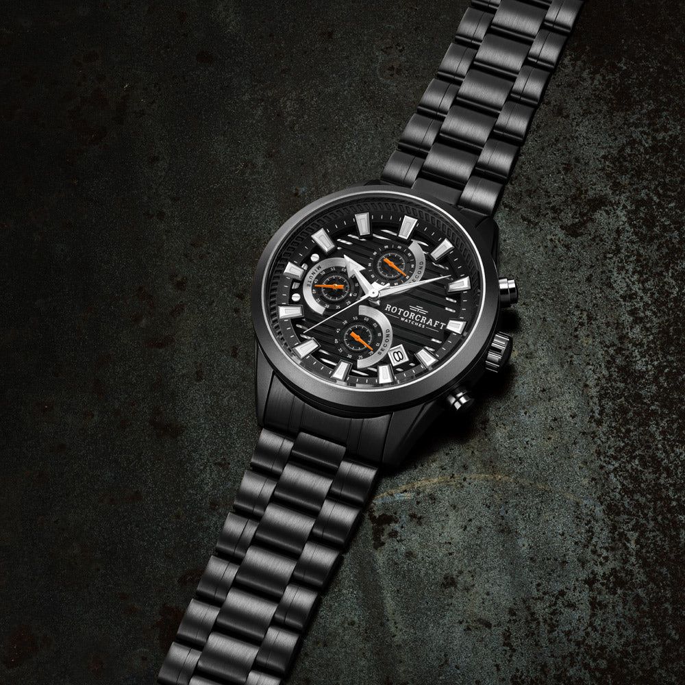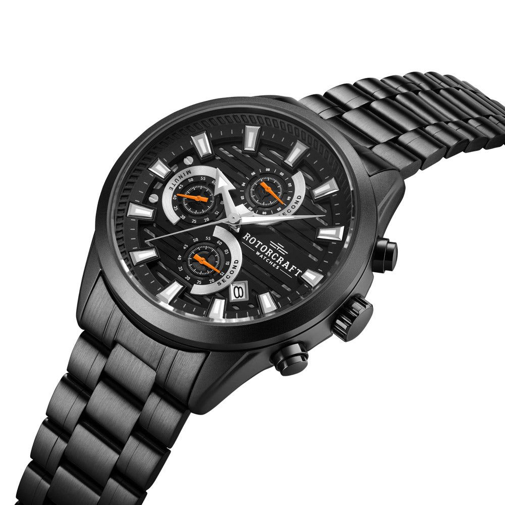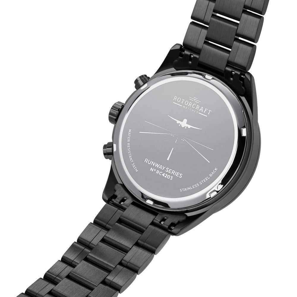 Dit oersterke Rotorcraft Runway RC4203 Chrono horloge is gemaakt van de allerbeste materialen. De geborstelde kast met strakke design details, is gemaakt van staal in de kleur zwart. Met een geborstelde zwarte armband van roestvrij staal is dit horloge erg stoer om te zien. De Runway RC4203 heeft niet alleen een datumaanduiding, maar ook een chronofunctie die wordt weergegeven in de subdials. Ook deze hulpwijzerplaten hebben een bijpassende zilverkleur, de opvallende zwarte wijzerplaat zorgt voor een mooi contrast. Het uurwerk wordt aangedreven door een LD57-3 Quartz Kaliber. Dit uurwerk heeft een datum- en chronograaffunctie. Het chrono-uurwerk geeft 1/10e van seconden, seconden en tot 60 minuten aan voor nauwkeurige (ronde)tijdregistratie. Interessante ontwerpdetails op dit Runway Rotorcraft horloge zijn de slanke, gedeeltelijk open wijzerplaat en strakke indexen. Het glas dat in dit opvallende model wordt gebruikt, is mineraal glas. Dit Rotorcraft Runway chrono horloge heeft een waterdichtheid van 3 ATM, dus geschikt voor het wassen van de handen.Specificaties